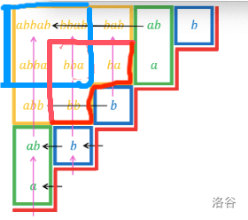 - 对于询问二,其实就是询问等价类中,一个点右下方有几个子串(红框)。